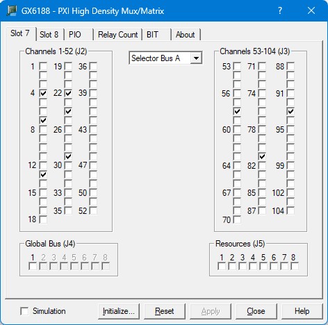 Global Bus (checkboxes): Displays the current relay setting (closed or open). When a box is checked, the relay referenced is closed and the global bus line is connected to the current Selector Bus. Unchecked boxes mean relays are open. Only one global bus line can be connected to each Selector Bus. The rest of the lines will be read-only.