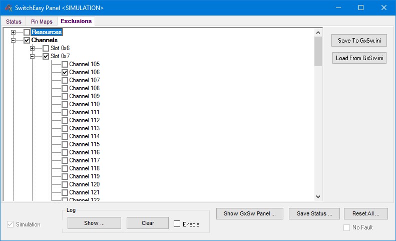 Exclusions (Tree): The tree view shows all resources, channels, and buses that are part of the switching subsystem. A marked checkbox indicates that the corresponding resource cannot be connected. For example, in the figure above, the Channel 106 has been checked. This indicates that this particular pin will not be allowed to make a connection to any resource, channel, or bus.