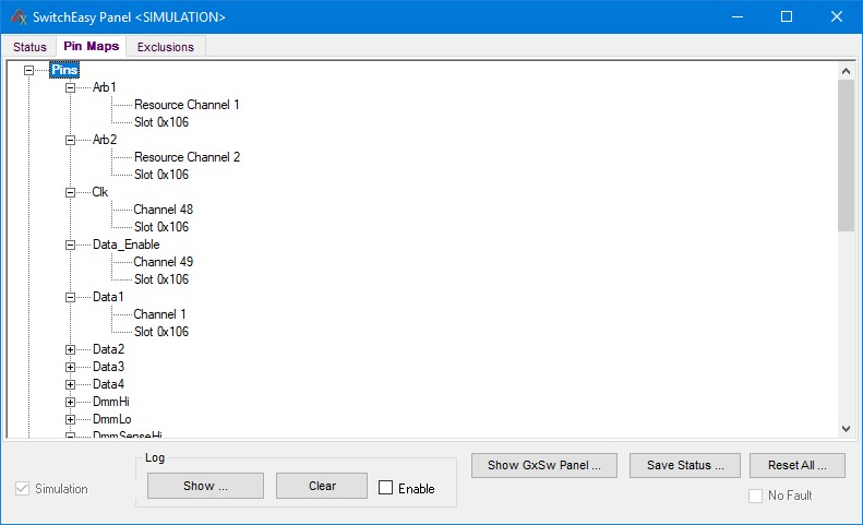 Pin Maps (Tree): The tree view shows currently mapped pins. Each mapped name node expands to show the channel and slot number of the pin.