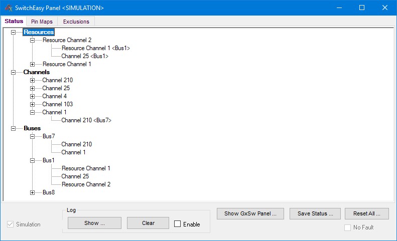 Status (Tree): The tree view shows currently made connections from the perspective of Resources, Channels, and Buses. The Resources node expands to show what channels pin are connected to each resource. The Channels node expands to show what each UUT Pin is connected to. Log Group Box