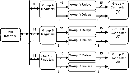 The GX6315 consists of three groups: A, B and C. Each group has 15 high-current relays, three open collector relay drivers and a connector as shown in the figure below: