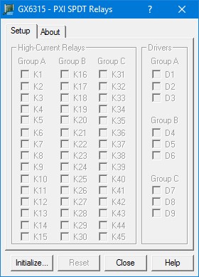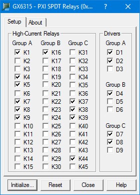 Relays Group Box (Relays K1 – K45): Displays the current relay setting (closed or open). When a box is checked, the relay is closed. Similarly, unchecked boxes mean relays are open.
