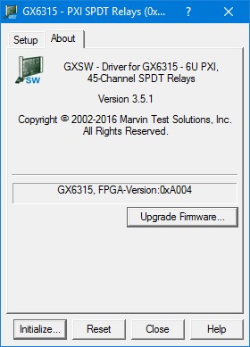 The top part of the About page displays version and copyright of the GX6315 driver. The bottom part displays the board summary and the FPGA version. The About page also contains a button Upgrade Firmware… used to upgrade the board FPGA. This button maybe used only when the board requires upgrade as directed by Marvin Test Solutions support. The upgrade requires a firmware file (.jam) that is written to the board FPGA. After the upgrade is complete you must shut down the computer to recycle power to the board.
