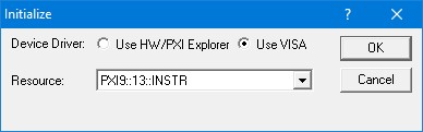 2. Use VISA – this is a third party device driver usually provided by National Instrument (NI-VISA). When selected, the Resource list displays the available boards installed in the system and their VISA resource address. The chassis, slots, devices and their resources are also displayed by the VISA resource manager, Measurement & Automation (NI-MAX) and in Marvin Test Solutions PXI/PCI Explorer. The following figure shows PXI9::13::INSTR as the VISA resource (PCI bus 9 and Device 13). This is VISA resource string argument (szVisaResource) passed by the panel when calling the driver Gx6315InitializeVisa function to initialize the driver with the specified board.