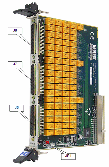 The GX6325 is a 6U PXI board featuring 75 channels of Single Pole Double Throw (SPDT) switches with three connectors J6, J7 and J8 and one chassis ground jumper - JP1.