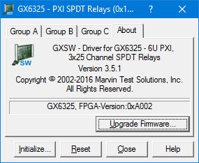 The top part of the About page displays version and copyright of the GX6325 driver. The bottom part displays the board summary and the FPGA version. The About page also contains a button Upgrade Firmware… used to upgrade the board FPGA. This button maybe used only when the board requires upgrade as directed by Marvin Test Solutions support. The upgrade requires a firmware file (.jam) that is written to the board FPGA. After the upgrade is complete you must shut down the computer to recycle power to the board.
