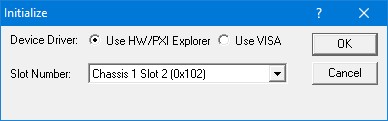 1. Use Marvin Test Solutions’ HW – this is the device driver installed by the setup program and is the default driver. When selected, the Slot Number list displays the available counter boards installed in the system and their slots. The chassis, slots, devices and their resources are also displayed by the HW resource manager, PXI/PCI Explorer applet that can be opened from the Windows Control Panel. The PXI/PCI Explorer can be used to configure the system chassis, controllers, slots and devices. The configuration is saved to PXISYS.INI and PXIeSYS.INI located in the Windows folder. These configuration files are also used by VISA. The following figure shows the slot number 0x102 (chassis 1 Slot 2). This is the slot number argument (nSlot) passed by the panel when calling the driver Gx6325Initialize function used to initialize driver with the specified board.
