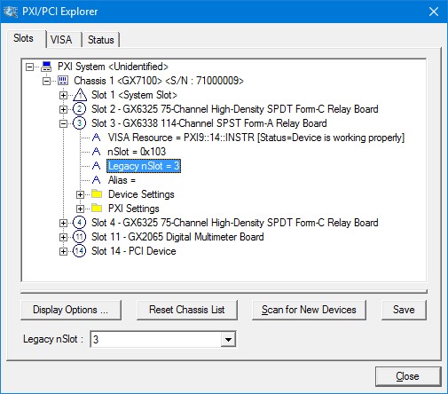 3. Change chassis numbers, PXI devices Legacy Slot numbering and PXI devices Alias names. These are optional steps and can be performed if you would like your chassis to have different numbers. Legacy slots numbers are used by older Marvin Test Solutions or VISA drivers. Alias names can provide a way to address a PXI device using a logical name (e.g. “DMM1”). For more information regarding slot numbers and alias names, see the GX6338Initialize and GX6338InitializeVisa functions.