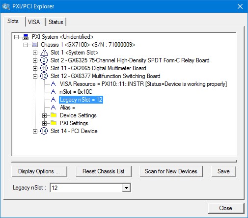 3. Change chassis numbers, PXI devices Legacy Slot numbering and PXI devices Alias names. These are optional steps and can be performed if you would like your chassis to have different numbers. Legacy slots numbers are used by older Marvin Test Solutions or VISA drivers. Alias names can provide a way to address a PXI device using a logical name (e.g. “DMM1”). For more information regarding slot numbers and alias names, see the GX6377Initialize and GX6377InitializeVisa functions.