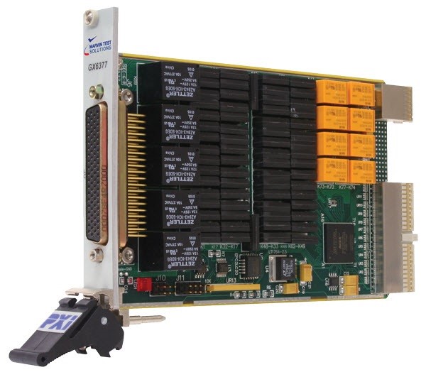 The GX6377 is a single slot 3U PXI/CompactPCI switching card combining different types of relays. The card contains high-power switching relays and two groups of 16x2 switch matrix for small signal switching. The high-power switching relays consist of 5 high current Form A SPST relays, 4 Form A SPST relays and 4 Form C relays. The Switch Matrix has a basic configuration of two groups of 2x16 and can be programmatically configured as one group of 2x32 or configured through jumpers as 4x16.