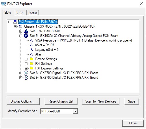 2. Identify Chassis and Controllers. After the PXI/PCI Explorer is started, it will scan your system for changes and will display the current configuration. The PXI/PCI Explorer automatically detects systems that have Marvin Test Solutions controllers and chassis. In addition, the applet detects PXI-MXI-3/4 extenders in your system (manufactured by National Instruments). If your chassis is not shown in the explorer main window, use the Identify Chassis/Controller commands to identify your system. Chassis and Controller manufacturers should provide INI and driver files for their chassis and controllers which are used by these commands.