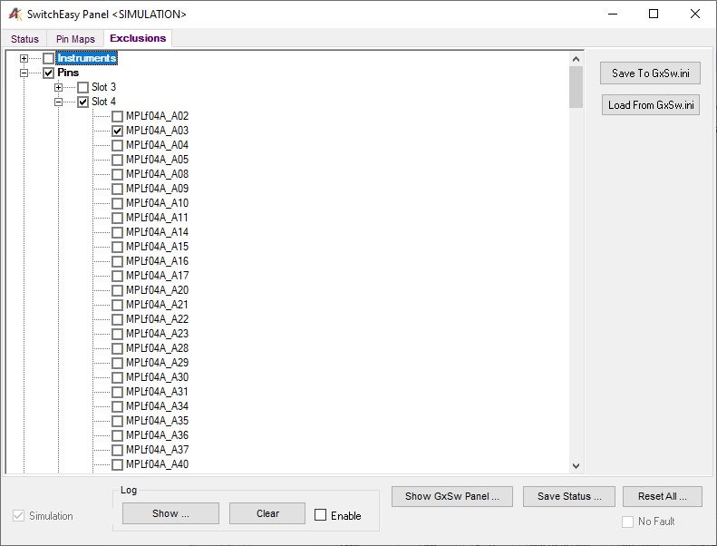 Exclusions (Tree): The tree view shows all instruments, pins, triggers, and buses that are part of the switching subsystem. A marked checkbox indicates that the corresponding resource cannot be connected. For example, in Figure 4‑3, the MPLf04A_A02 pin has been checked. This indicates that this particular pin will not be allowed to make a connection to any instrument resource, pin, trigger, or bus.