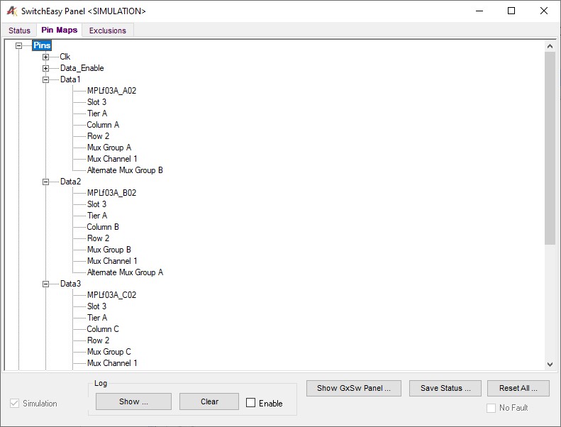 Pin Maps (Tree): The tree view shows currently mapped pins. Each mapped name node expands to show the physical location and description of the pin. For example, in Figure 4‑2, the Data 4 node is expanded to show its location at Slot 3, Tier A, Column D, and Row 2. Mux group (D) and Mux Channel (1) are also displayed to provide the user more information about the physical pin.