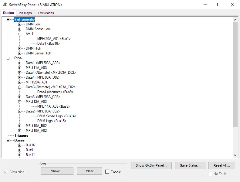 The SwitchEasy Panel is designed to work as a standalone application that displays the switching subsystem's current status. The panel lists the instrument pins, UUT pins, triggers, and busses that are currently in use by the subsystem.