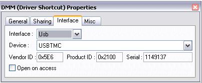 - Right click on the driver shortcut and go to the properties to select "USB" within the interfaces tab. Select your USBTMC device in the drop down menu labled "Device".