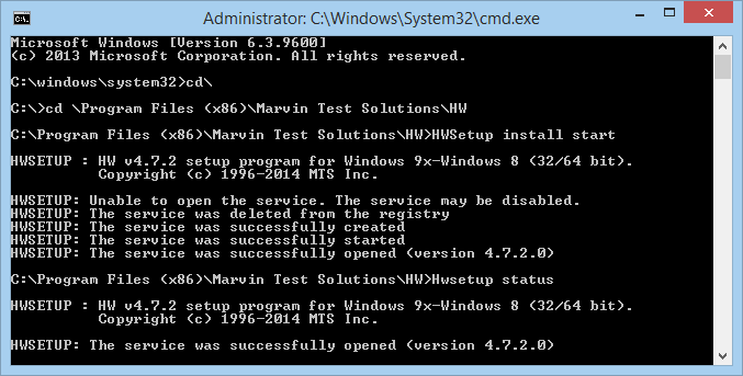 3. Type: cd \Program Files\Marvin Test Solutions\HW, use Program Files (x86) when using a 64-bit machine. If that folder does not exist, you need to install HW from Marvin Test website HW product, downloads tab: Download HW