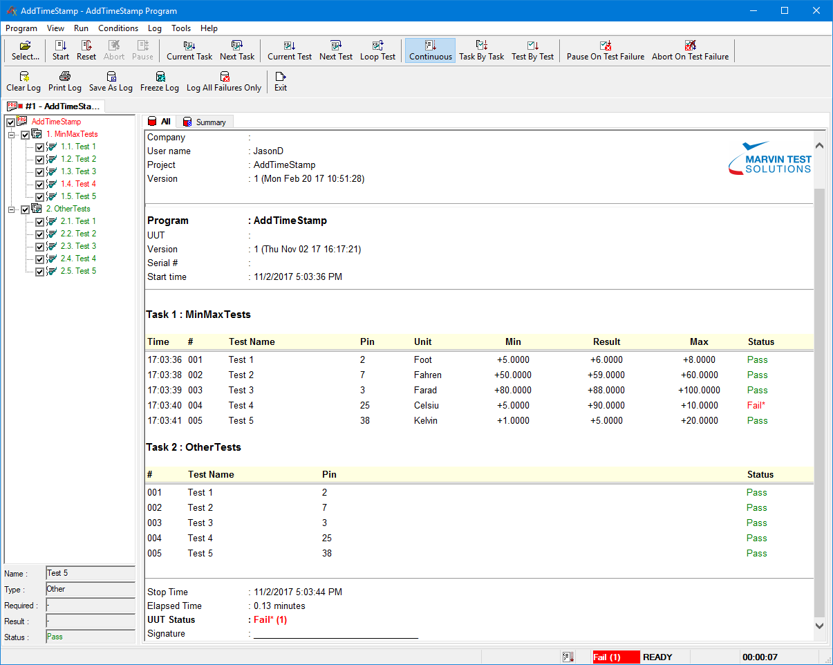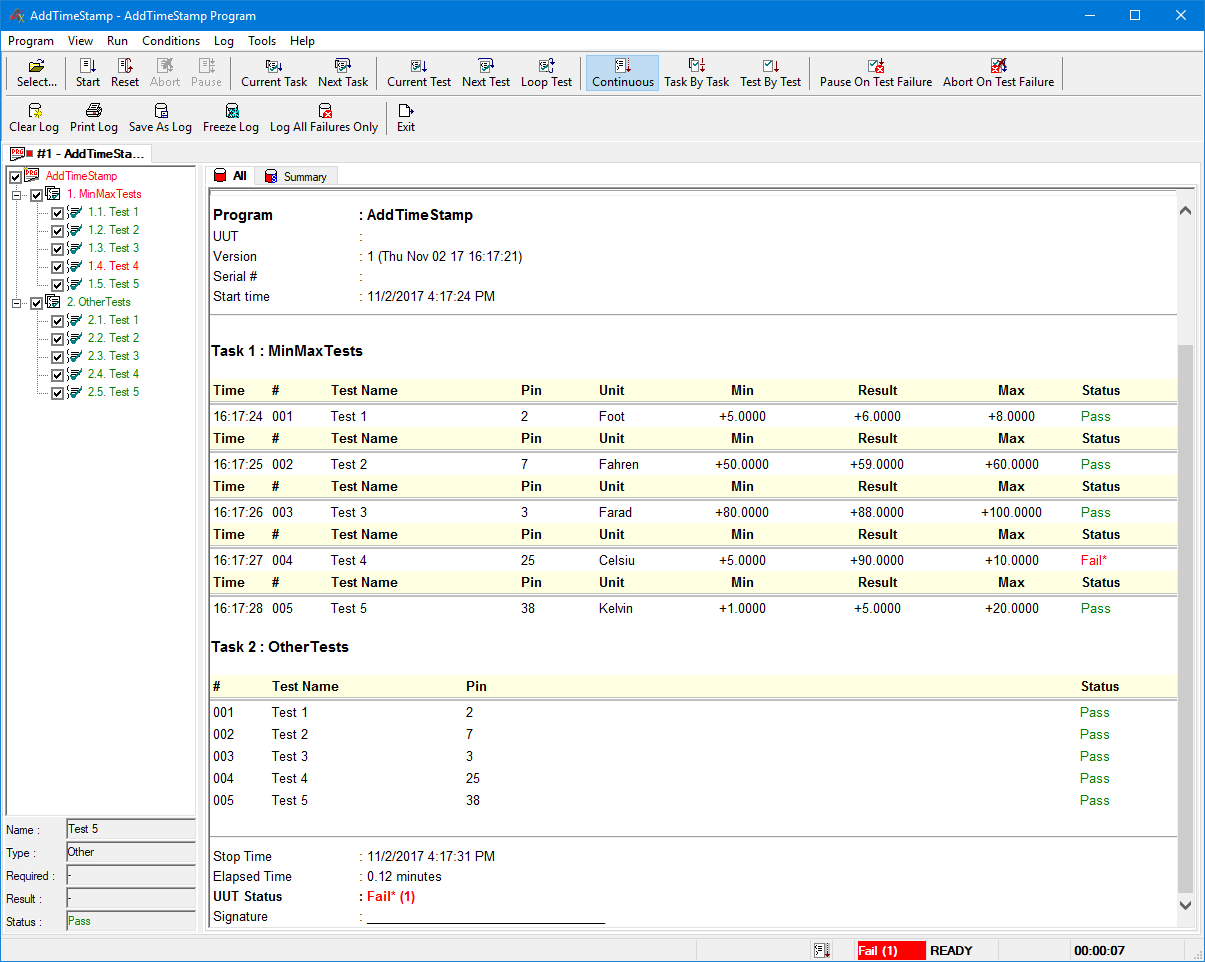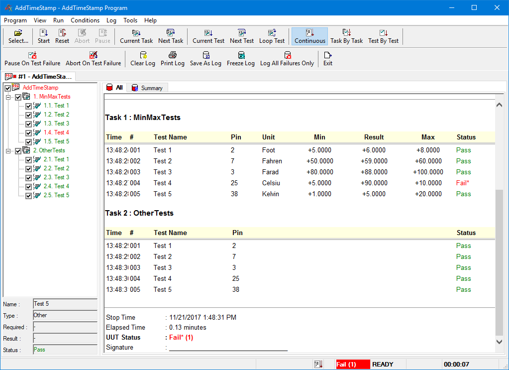 In this example the strings were separated into different lines for readability. Leaving the string as one line is also valid. Put a backslash before each of the inner quotations to use quotation marks inside of a string declaration. Ie: sString="Bob said "hello" to Joe." becomes sString="Bob said \"hello\" to Joe." In sTest, the procedure STime() is used to get the current time. In sTest, FONT COLOR was removed from the Status field because ATEasy will add the color automatically when the test status is evaluated. The data in the sTest string need to be replaced by the appropriate field parameters. For more information on the field parameters, use the ATEasy Help (F1) and search for "FormatLogString" in the Index tab.