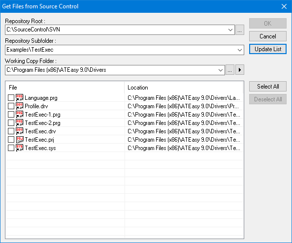 7. To add the other files that reside under the Drivers folder, repeat steps 4 and 5. Select the Profile and the Test Exec drivers and add them to the repository under the Drivers subfolder and C:\Program Files\ATEasy 9.0\Drivers working folder.